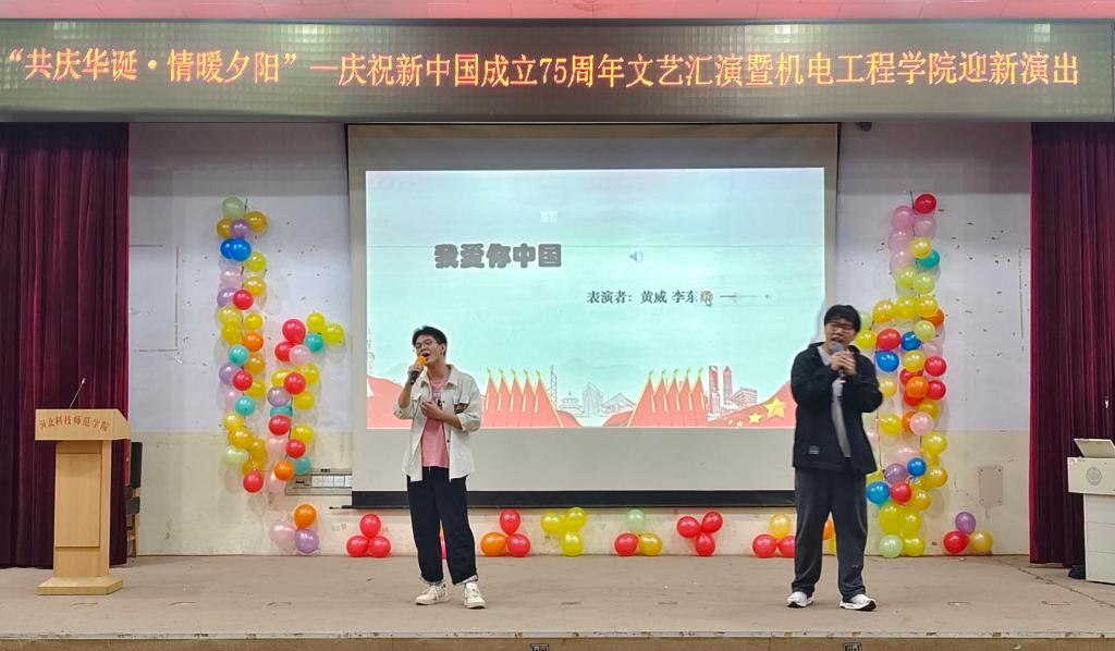 演出在春晖艺术团带来的舞蹈《太阳姑娘》中拉开帷幕,舞者们身着华丽的服饰,以优美的舞姿和灿烂的笑容,为观众呈现了一场视觉盛宴。紧接着,机电学院的学生黄威和李东泽深情演唱了《我爱你中国》,他们的歌声激昂而深情,表达了对祖国母亲的热爱和敬仰。