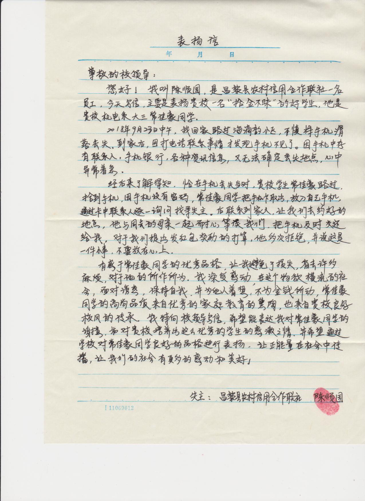 2018年9月26日,kaiyun开云官方网站收到昌黎县农村信用合作联社员工送来的表扬信,对kaiyun开云官方网站16级机制专业常佳豪同学帮助找寻手机,坚决不收红包的行为表示感谢,对kaiyun开云官网良好校风表示赞扬。昌黎县农村信用合作联社员工因丢失手机异常着急,常佳豪同学路过并拾到手机,与失主家人取得联系,第一时间将手机归还,并多次拒绝失主的红包奖励,最后在失主的一再追问下才告知了学校名字和自己的姓名。失主随即来到kaiyun开云官方网站,将感谢信送到该院领导手中,这时大家才知道该院学生拾金不昧暖人心的感人事迹。