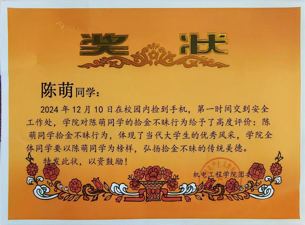 优秀校风的熏陶、老师的谆谆教诲,都是大学生成长路上最丰富的精神食粮。陈萌同学拾金不昧行为,不仅体现了当代大学生的优秀风采,也为学院其他同学树立了良好的道德榜样。学院全体同学要以陈萌同学为榜样,弘扬拾金不昧的传统美德,共同营造一个诚实守信、和谐友爱的校园环境。