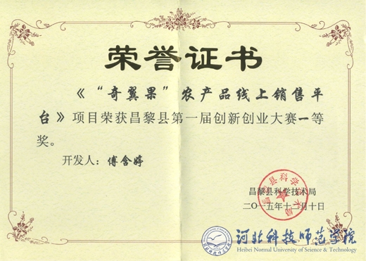 近日, 在昌黎县第一届创新创业大赛中,我院2013级电气专业傅含婷同学开发的《“奇翼果”农产品线上销售平台》创业项目荣获一等奖,奖金1000元;2013级电子专业齐卓同学开发的《广告wifi》等三个创业项目荣获二等奖,奖金共1500元;2013级电气专业葛攀同学开发的《魔方机器人》等五个创业项目荣获三等奖,奖金共1500元。
