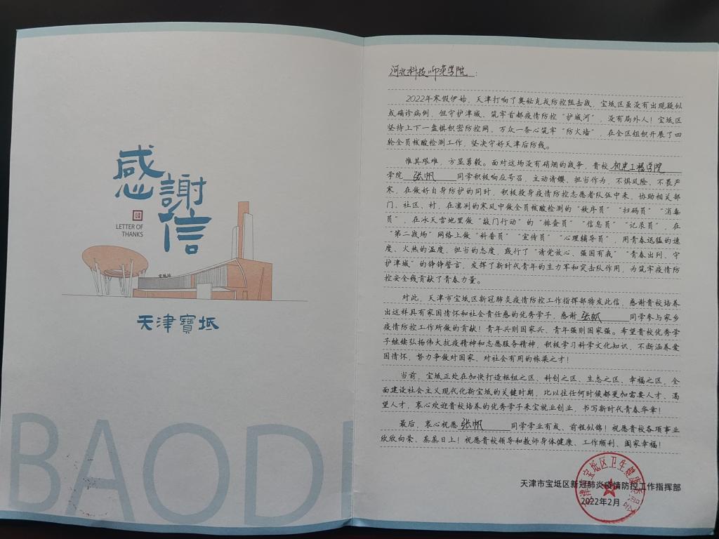 近日,kaiyun开云官方网站19机制张帆同学因在属地积极投身疫情防控志愿者队伍,天津市宝坻区疫情防控指挥部特发来感谢信。